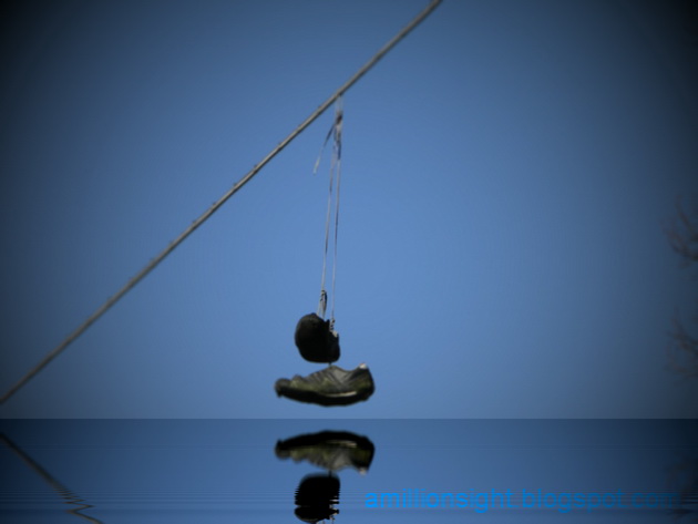 Walking around the town and I saw this shoes view above the street hanging on the electricity cable. Its must be so lonely there hanging all the time.